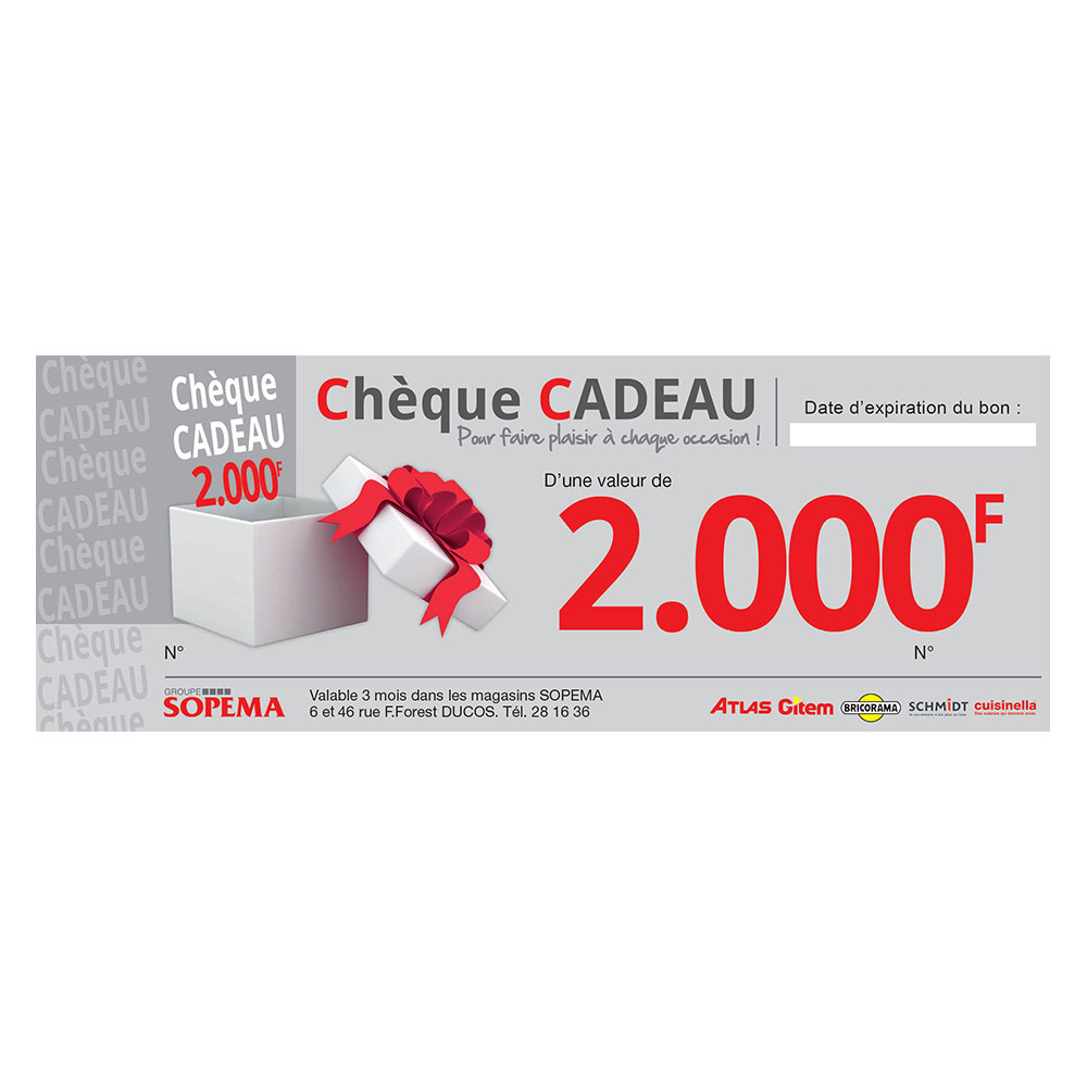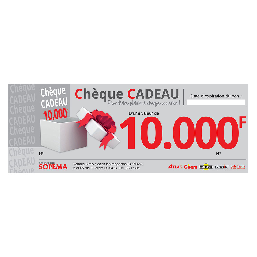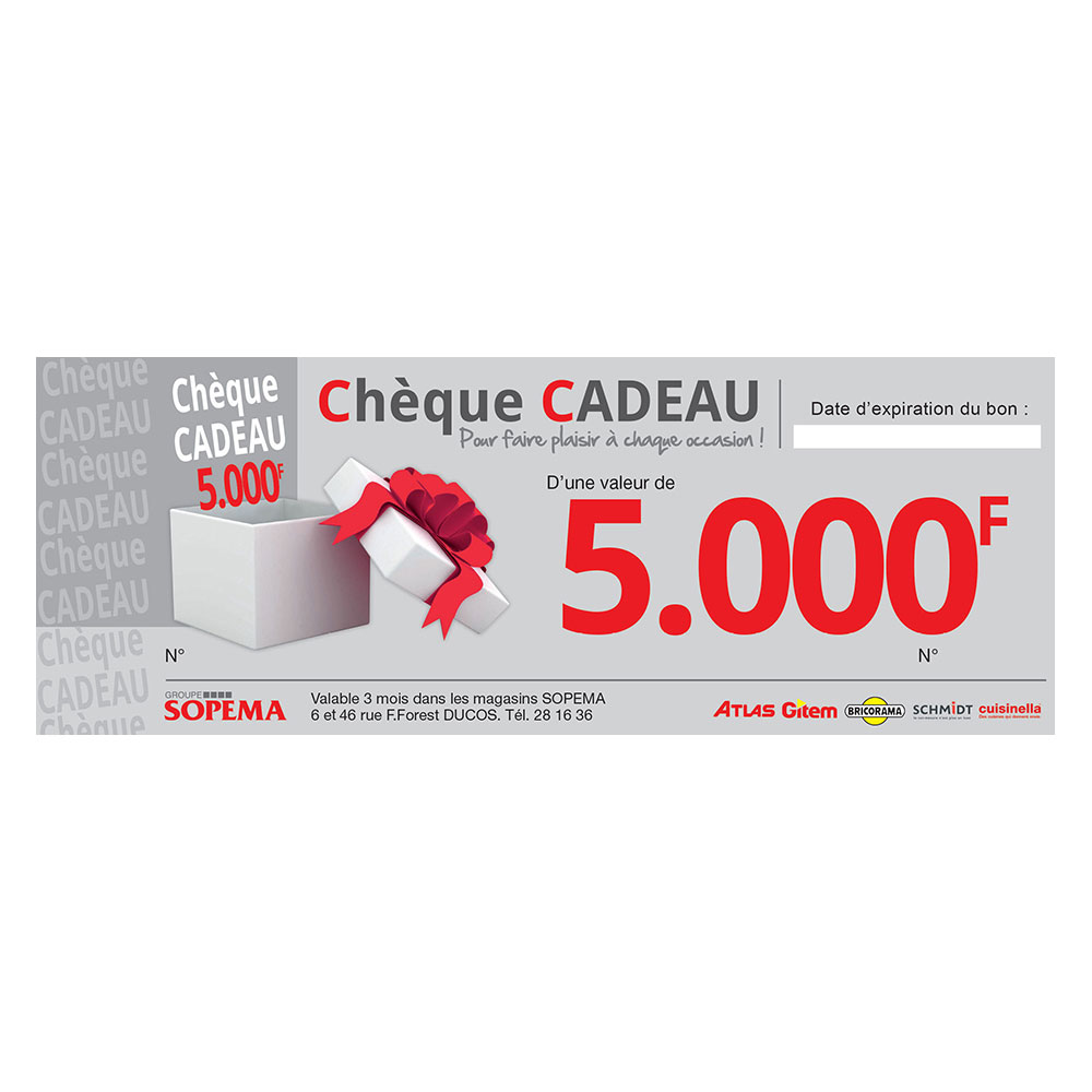 Chèque cadeau utilisable dans l’ensemble des magasins du Groupe SOPEMA, valide 3 mois