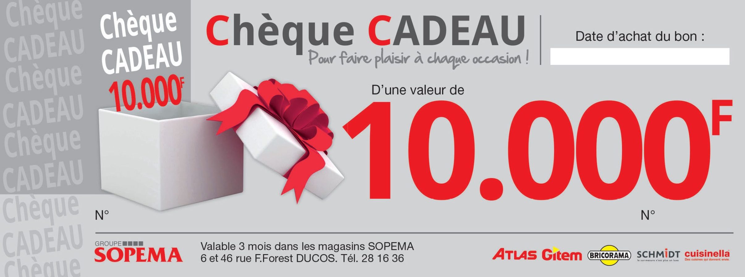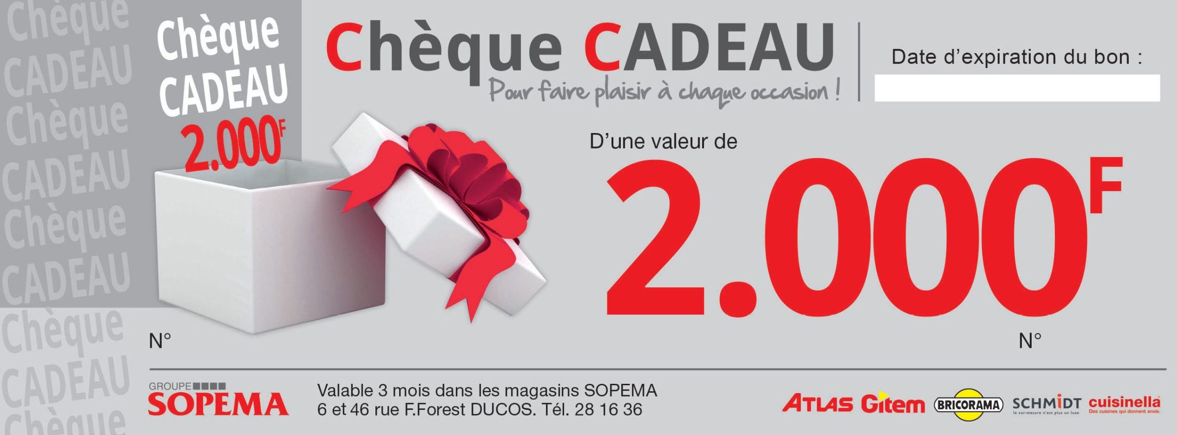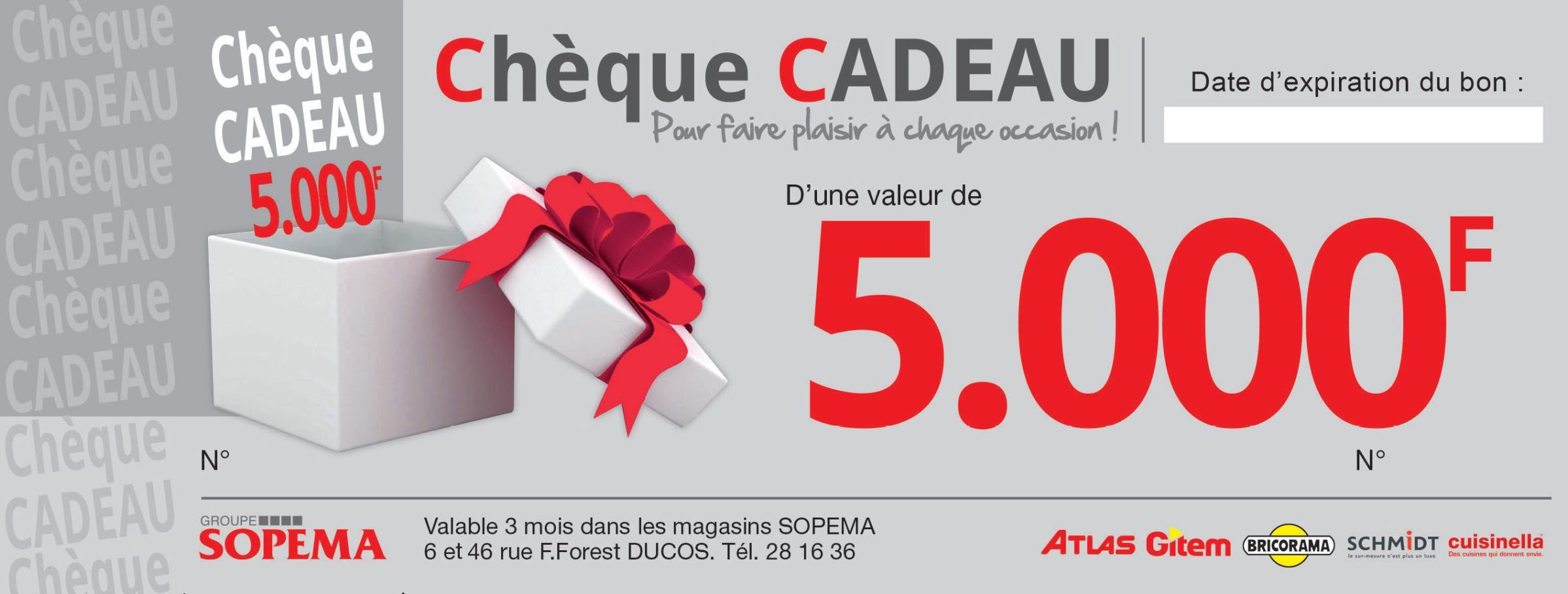 Chèque cadeau utilisable dans l’ensemble des magasins du Groupe SOPEMA, valide 3 mois